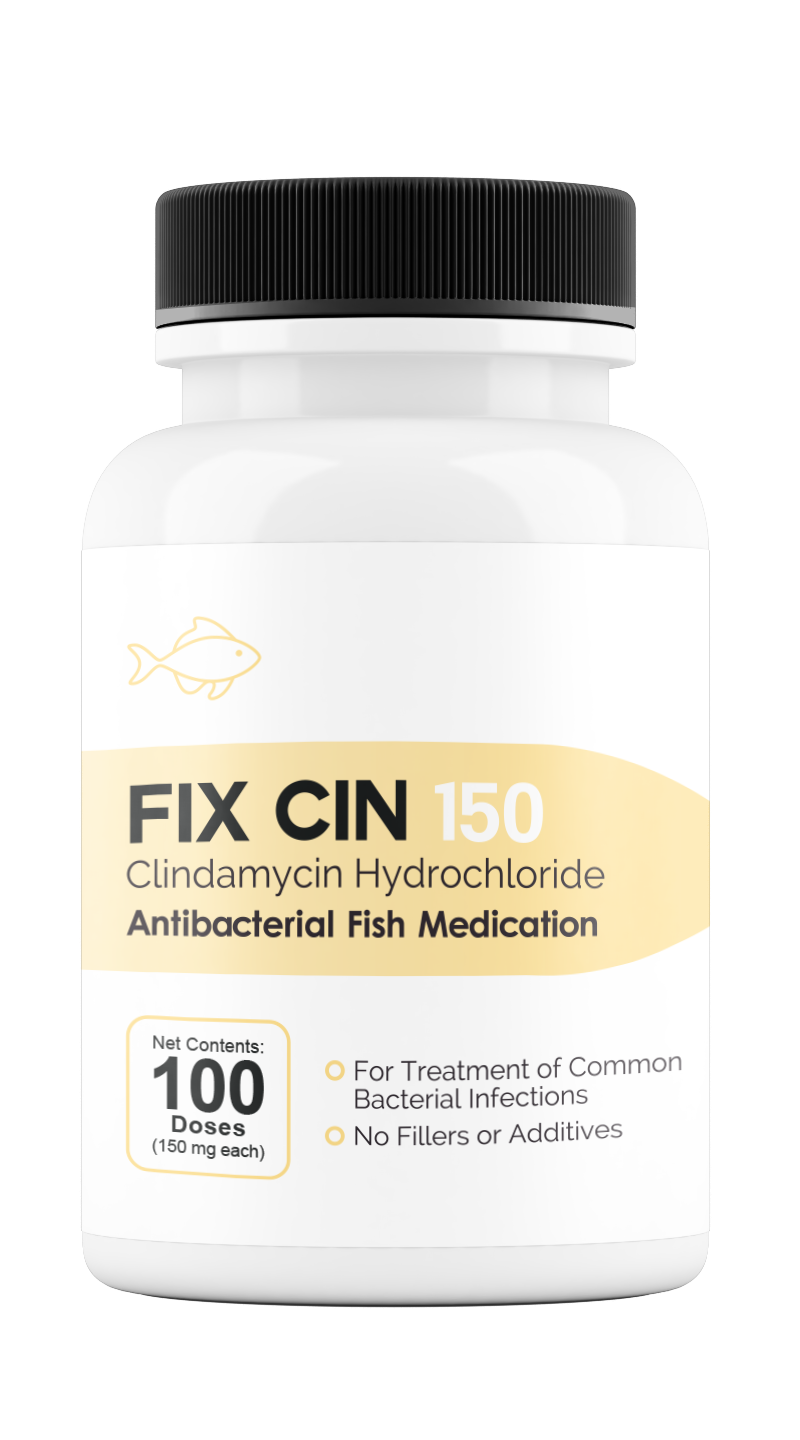 Fix Clin - Clindamycin 150 mg 100 Count  is an antibiotic that exerts a bactericidal action on gram-positive and some gram-negative bacteria in fish. Used for the control of some common bacterial fish diseases, such as Aeromonas, Pseudomonas, and Mycobacterial (Gill diseases and Chondrococcus).